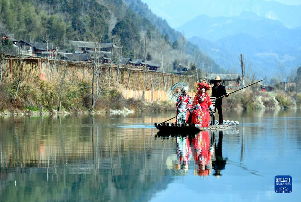 1月31日,在宣恩縣彭家寨風(fēng)景區的古吊腳樓前,游客乘坐竹筏在小河中游玩。