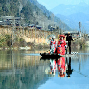 在鄂西山區湖北省宣恩縣的彭家寨古吊腳樓前,一條小河碧波蕩漾。古色古香的吊腳樓、清澈見(jiàn)底的河水、晃晃悠悠的吊橋,構成一幅“小橋流水人家”的鄉村畫(huà)卷,吸引游客前往賞景游玩。