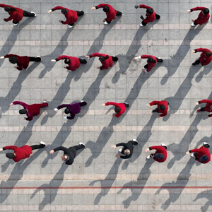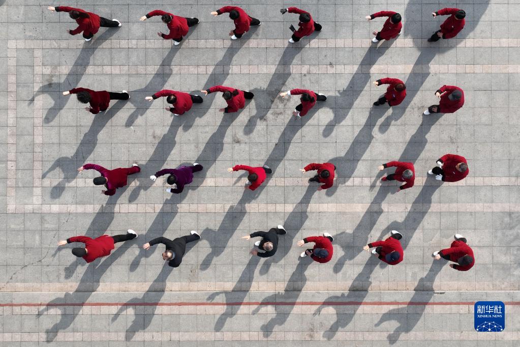 1月31日,太極拳愛(ài)好者在清河縣武松公園表演太極拳(無(wú)人機照片)。