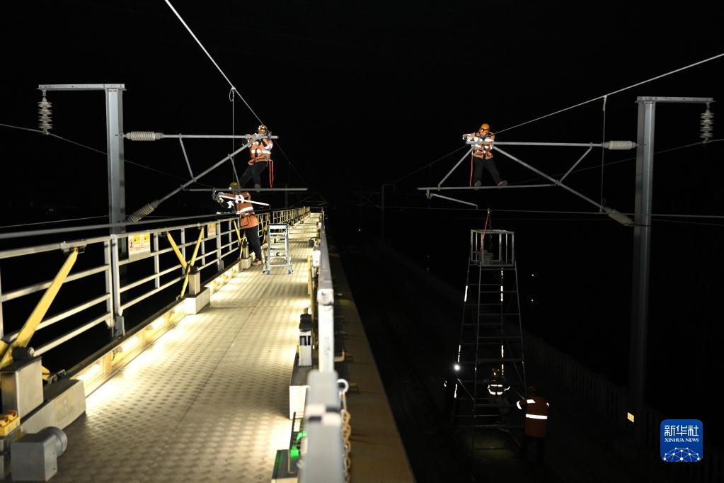 春運期間,中國鐵路上海局集團有限公司南京供電段接觸網(wǎng)維修車(chē)間的接觸網(wǎng)工們冒著(zhù)寒風(fēng),搶抓凌晨“天窗”時(shí)段,對接觸網(wǎng)設備展開(kāi)全方位檢修,排除隱患,確保列車(chē)通行安全。