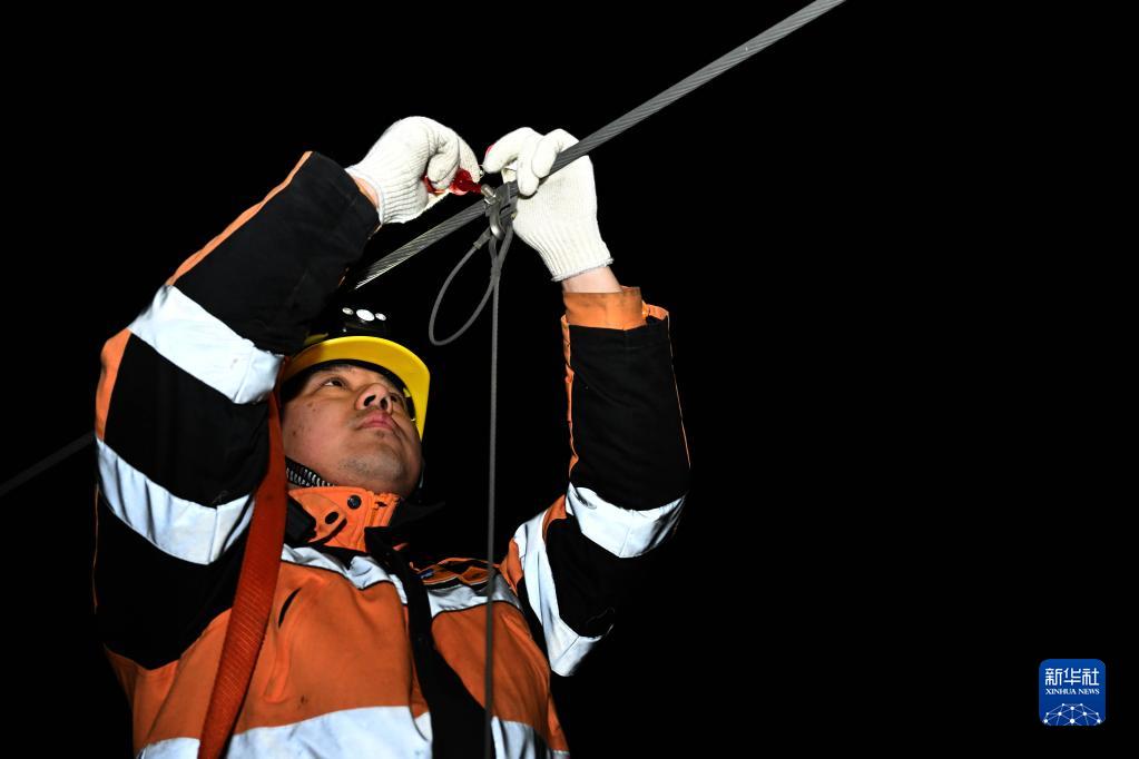 春運期間,中國鐵路上海局集團有限公司南京供電段接觸網(wǎng)維修車(chē)間的接觸網(wǎng)工們冒著(zhù)寒風(fēng),搶抓凌晨“天窗”時(shí)段,對接觸網(wǎng)設備展開(kāi)全方位檢修,排除隱患,確保列車(chē)通行安全。