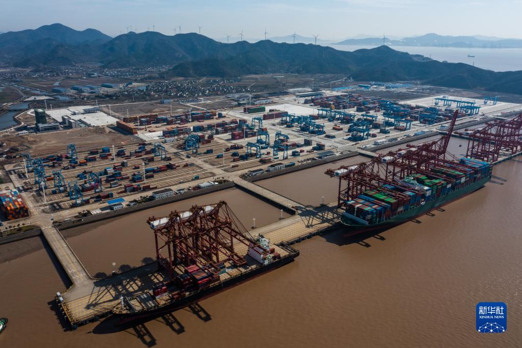 空中俯瞰位于浙江省舟山市金塘島的寧波舟山港金塘港區大浦口集裝箱碼頭(1月31日攝,無(wú)人機照片)。