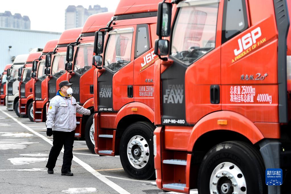 在位于吉林長(cháng)春的一汽解放智慧物流公司整車(chē)物流部停車(chē)場(chǎng),員工對即將轉運交付的車(chē)輛進(jìn)行巡檢(1月31日攝)。