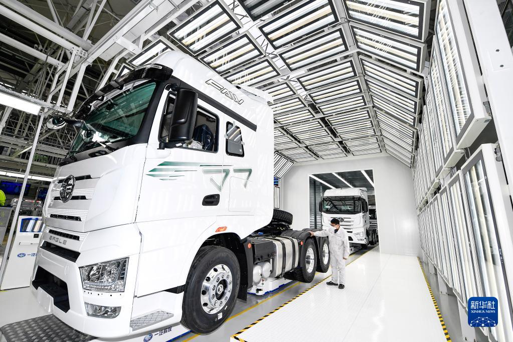 工作人員在位于吉林長(cháng)春的一汽解放J7智能工廠(chǎng)內進(jìn)行整車(chē)裝配作業(yè)(1月31日攝)。