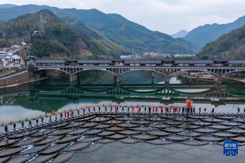 2月1日,窈口村女子板龍隊在湖源鄉的龍鱗壩碇步橋上進(jìn)行舞龍表演(無(wú)人機照片)。