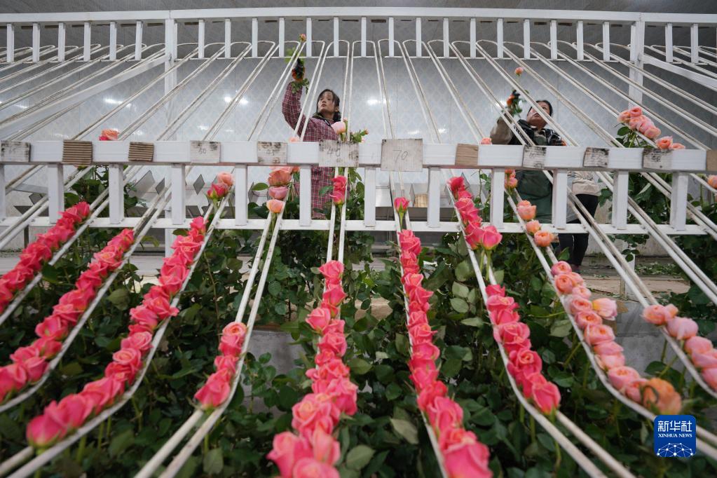 2月1日,村民在河北邱縣盛水灣玫瑰產(chǎn)業(yè)園整理玫瑰花。