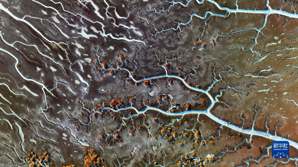近日,在遼寧盤(pán)錦遼河口濕地,海水在潮汐作用下涌入遼河口濕地的潮溝,并凝結成冰,從高空看去,宛若蜿蜒曲折、形態(tài)各異的“冰脈”。
