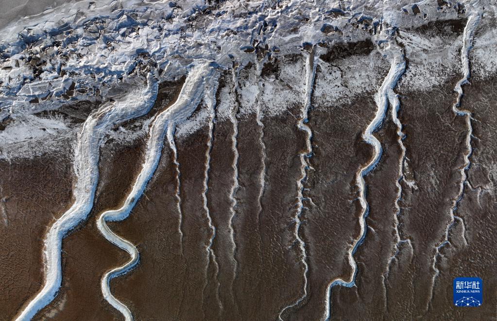 近日,在遼寧盤(pán)錦遼河口濕地,海水在潮汐作用下涌入遼河口濕地的潮溝,并凝結成冰,從高空看去,宛若蜿蜒曲折、形態(tài)各異的“冰脈”。