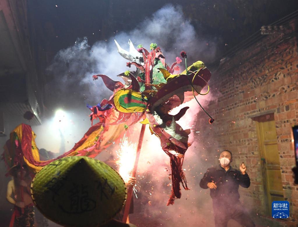 人們在廣西南寧市賓陽(yáng)縣縣城舞炮龍(2月1日攝)。