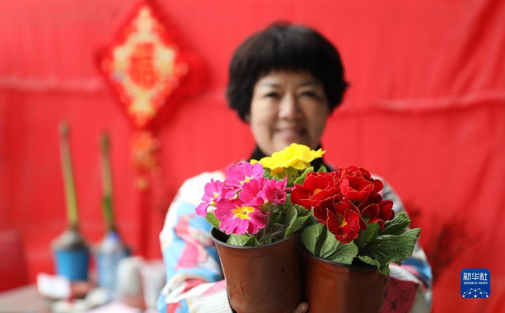 2月1日,沈陽(yáng)市十里河街道花卉基地一位花農在大棚內展示她家銷(xiāo)售的報春花。