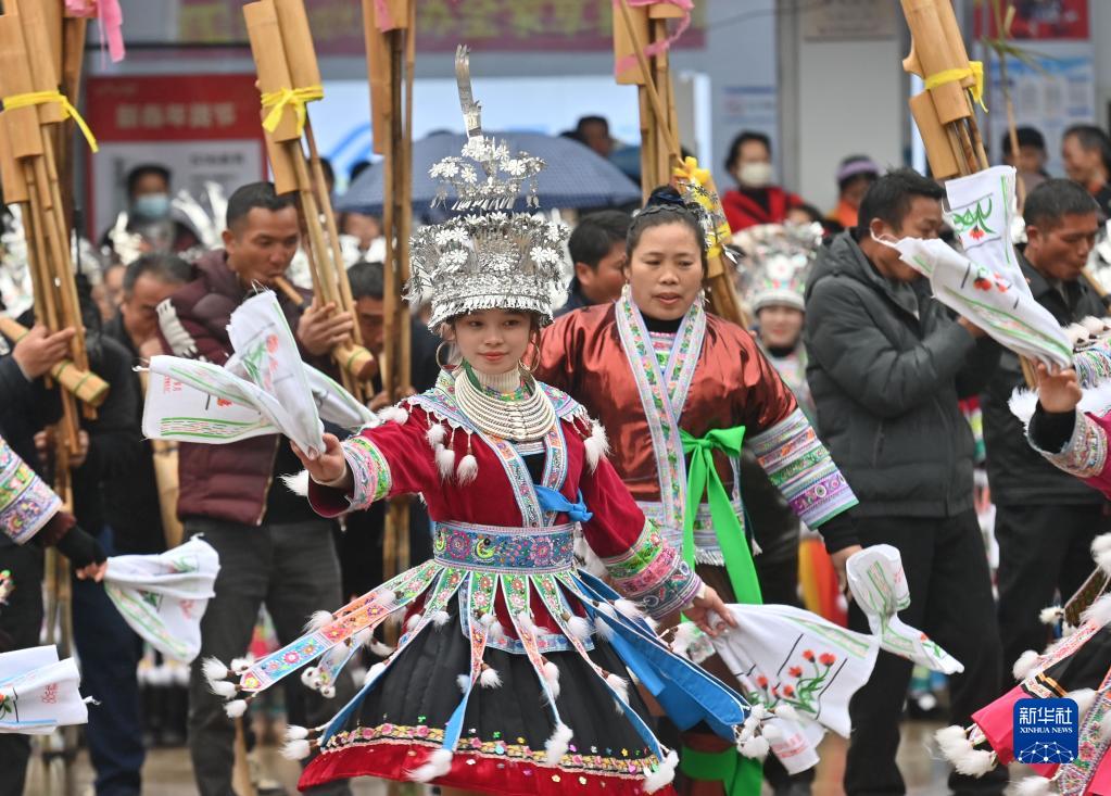 2月2日,融水苗族自治縣桿洞鄉苗族姑娘在跳苗舞。