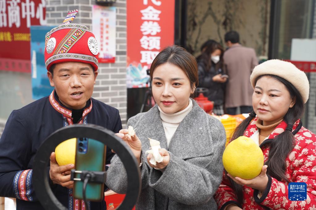 網(wǎng)絡(luò )主播在湖南省江永縣年貨節現場(chǎng)進(jìn)行助農直播(1月8日攝)新華社發(fā)