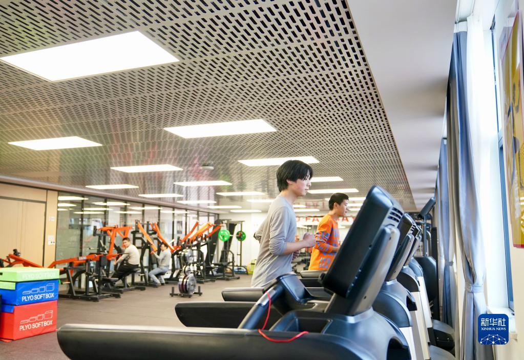 江西國軒新能源科技有限公司實(shí)習員工周詩(shī)航(左)在公司的健身房跑步鍛煉(2月2日攝)。