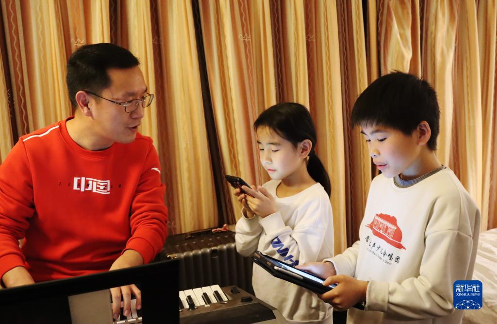 馬蘭花兒童聲合唱團聲樂(lè )老師王金山(左)指導孩子們排練(1月18日攝)。