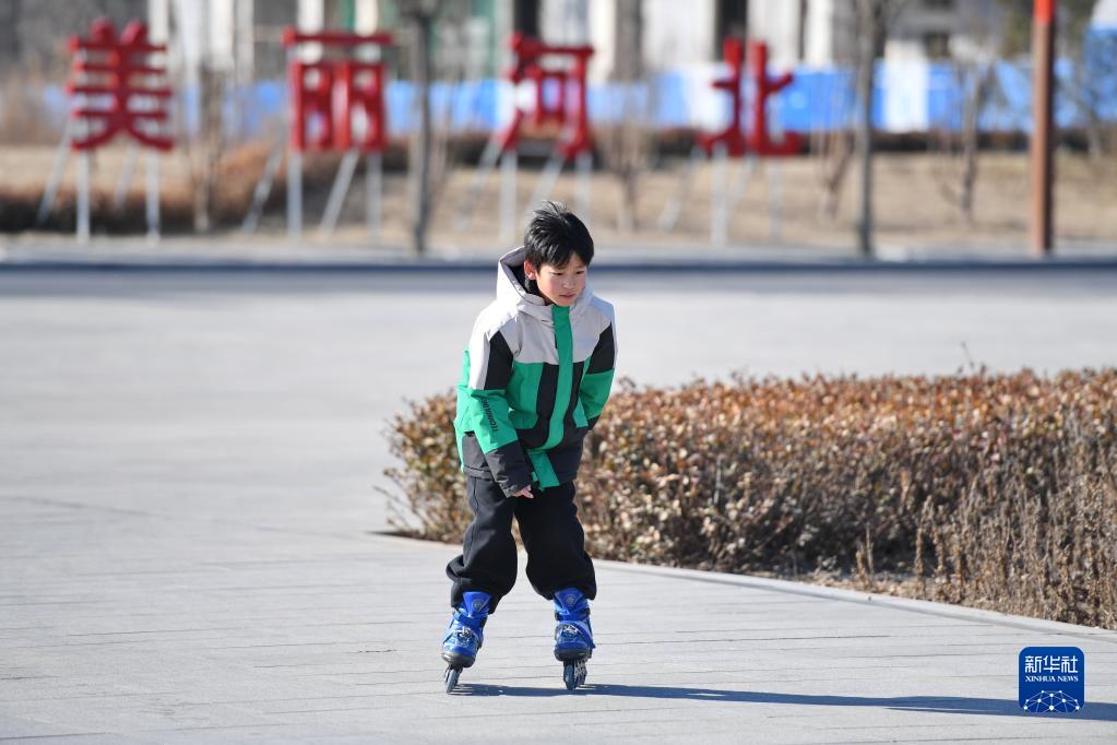 馬蘭花兒童聲合唱團團員顧站豪在河北省保定市阜平縣的一個(gè)廣場(chǎng)上滑輪滑(1月30日攝)。