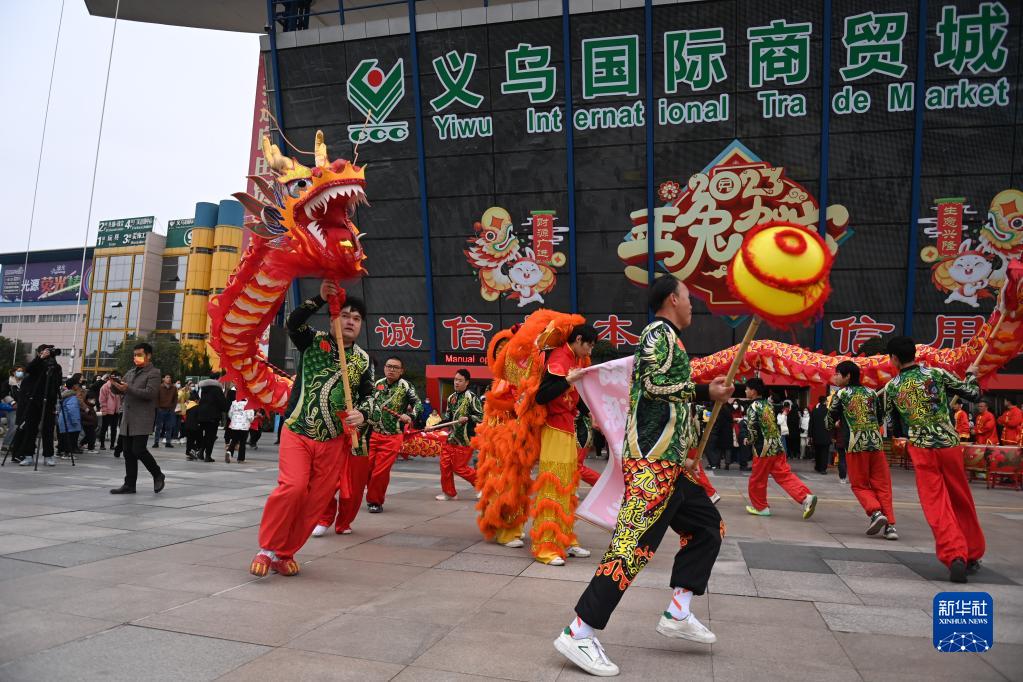 舞龍隊在義烏國際商貿城門(mén)口的廣場(chǎng)表演,迎接商貿城兔年開(kāi)市(2月2日攝)。