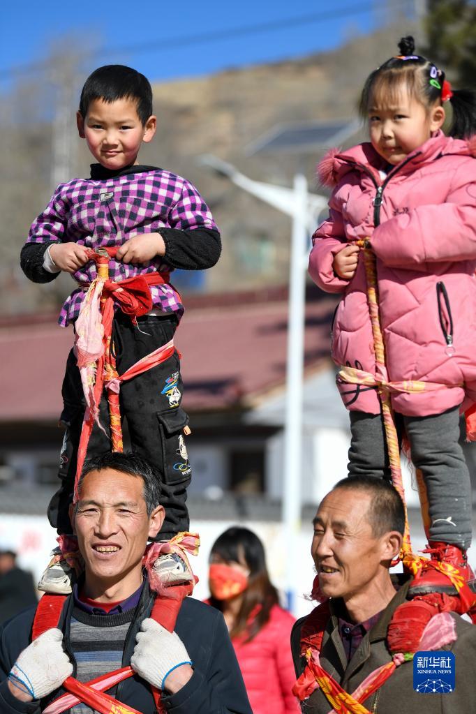 2月3日,寧夏固原市隆德縣觀(guān)莊鄉陽(yáng)洼村村民在排練扛社火??干缁鹗怯缮韽娏训某赡昴凶蛹缈钙鹉挲g較小的孩子,扮演成各種不同的戲曲人物,在行走中進(jìn)行表演,是社火演出的一種形式。