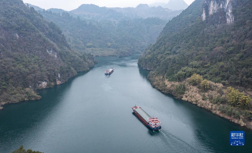2月3日,貨船從余慶縣沙灣碼頭駛出(無(wú)人機照片)。