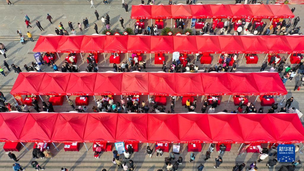 2月4日,求職者在江蘇省南京市六合區經(jīng)濟開(kāi)發(fā)區舉辦的“走進(jìn)園區 服務(wù)企業(yè) 360°微服務(wù)”專(zhuān)場(chǎng)招聘會(huì )上了解招聘信息(無(wú)人機照片)。