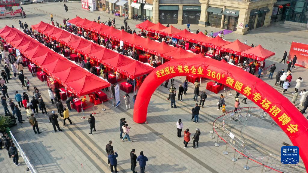 2月4日,求職者在江蘇省南京市六合區經(jīng)濟開(kāi)發(fā)區舉辦的“走進(jìn)園區 服務(wù)企業(yè) 360°微服務(wù)”專(zhuān)場(chǎng)招聘會(huì )上了解招聘信息(無(wú)人機照片)。