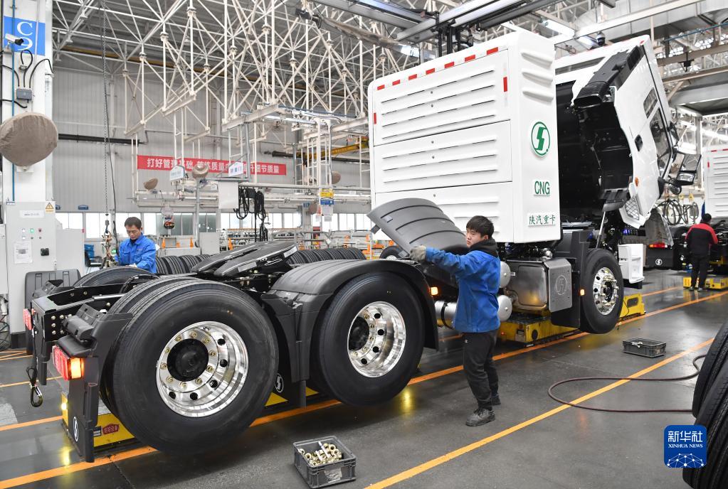 2月2日,工人在陜汽控股集團重卡總裝車(chē)間裝配卡車(chē)。