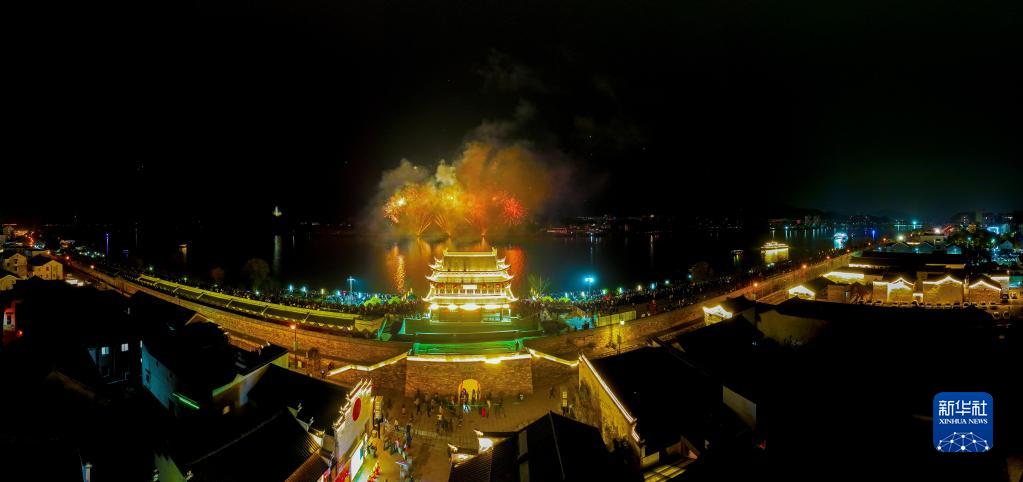 2月4日,浙江省建德市梅城鎮嚴州古城上空焰火綻放(無(wú)人機照片)。