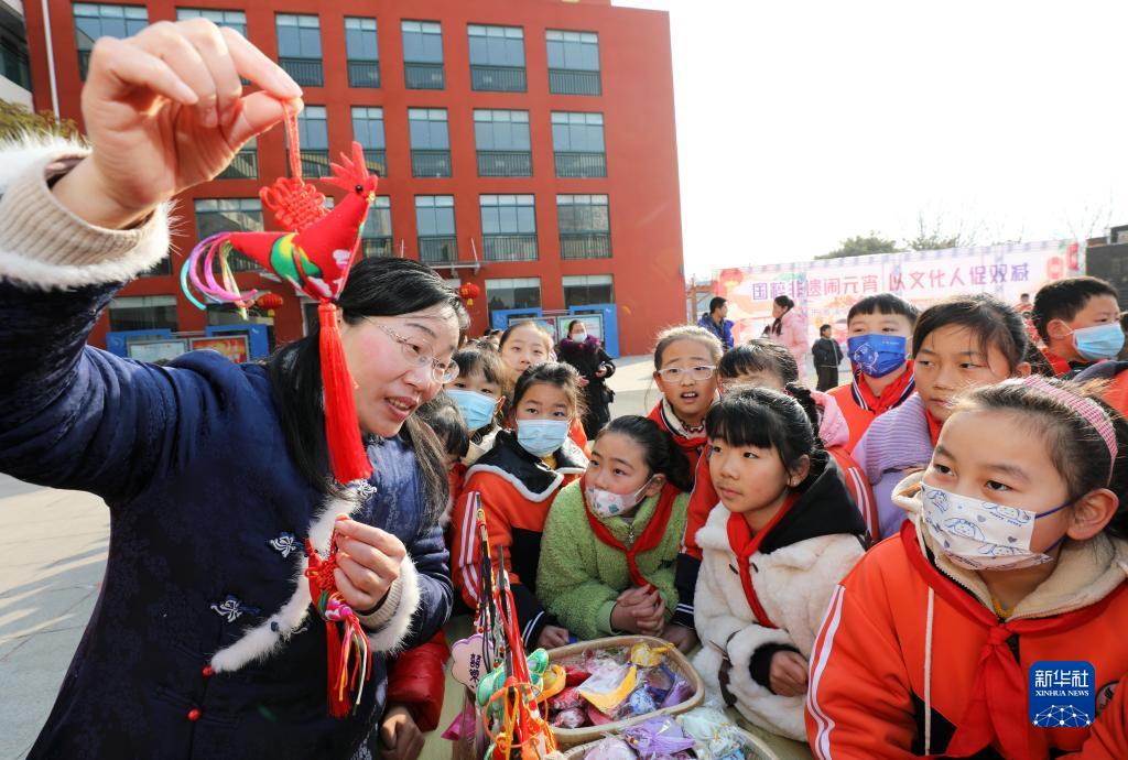 2月4日,在安徽省淮北市濉溪路小學(xué),非遺文化傳人向學(xué)生講解立春“春雞”手工香包。