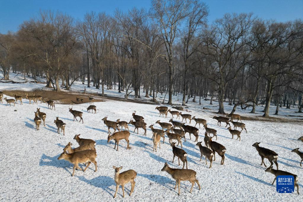 2月4日,一群梅花鹿在中國龍江森林工業(yè)集團有限公司平山皇家鹿苑內覓食(無(wú)人機照片)。