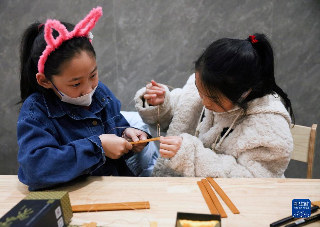 2月4日,小朋友在中國文字博物館體驗竹簡(jiǎn)制作。