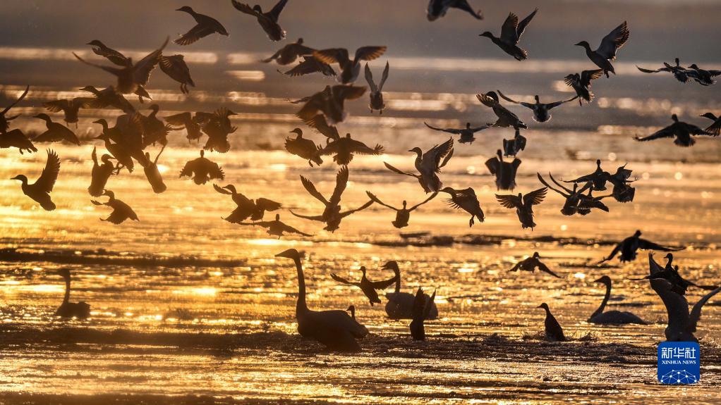 2月3日,黃河西岸的合陽(yáng)黃河濕地自然保護區內,群鳥(niǎo)翔集嬉戲。