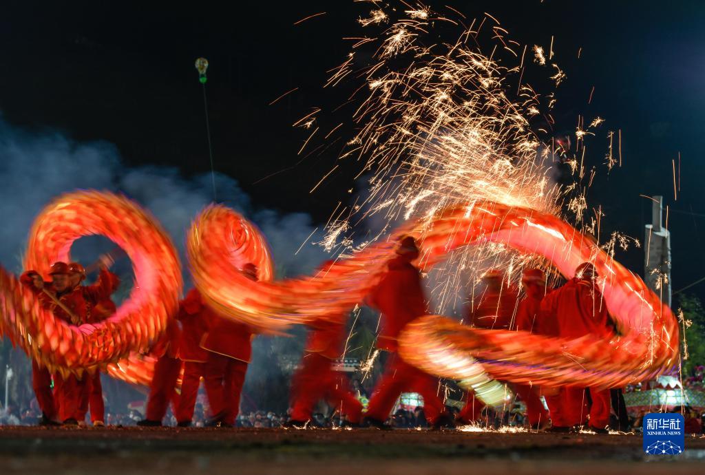 苗族“舞龍噓花”是當地人用土火藥和楠竹等制成噓花筒向舞動(dòng)的彩龍噴射所形成的絢麗景象。2021年,苗族“舞龍噓花”習俗入選國家級非物質(zhì)文化遺產(chǎn)名錄。