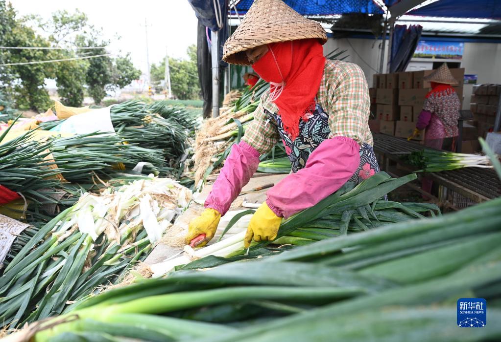 2月4日,村民在漳浦縣六鰲鎮整理大蔥。