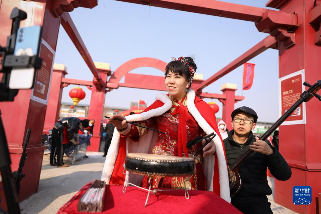 2月5日,演員在有著(zhù)300余年歷史的遼寧省營(yíng)口紅旗大集上表演東北大鼓。