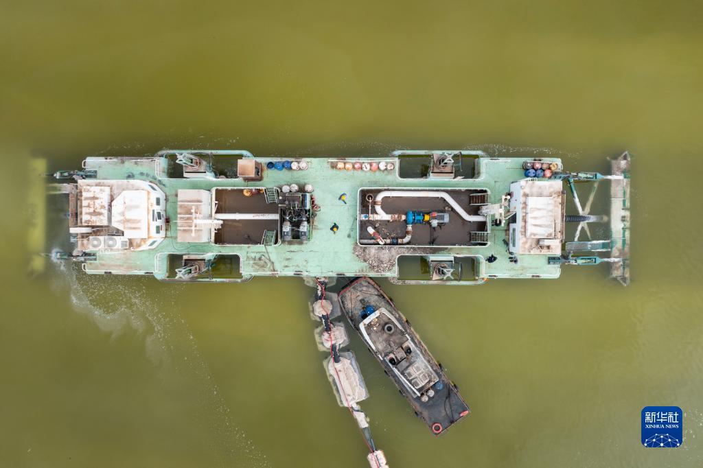 2月2日,賀連福乘坐工作船(下)到達水采船(上)。水采船在劇毒的鹵水鹽田中作業(yè),工作人員每天上下水采船都要通過(guò)工作船接駁。