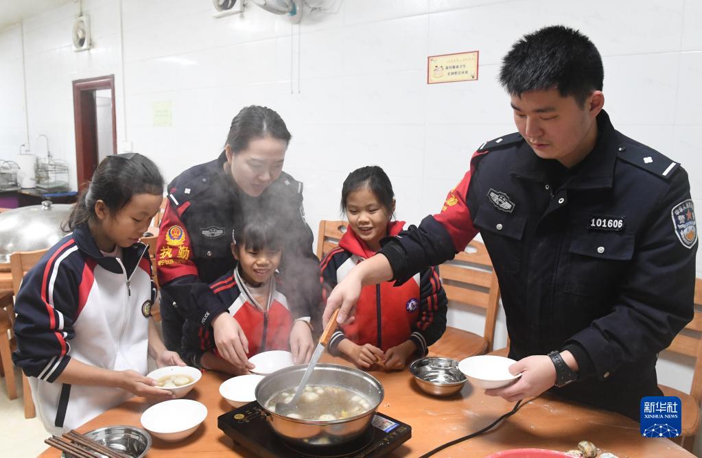 2月5日,在南寧鐵路公安局南寧公安處賓陽(yáng)站派出所,民警與三姐妹一起煮湯圓。家住賓陽(yáng)縣和吉鎮三叉村的呂秀清、呂秀萍和呂秀玲三姐妹,是當地的留守兒童,派出所青年民警志愿者常常利用業(yè)余時(shí)間輔導她們學(xué)習,疏導心理,至今已經(jīng)4年。