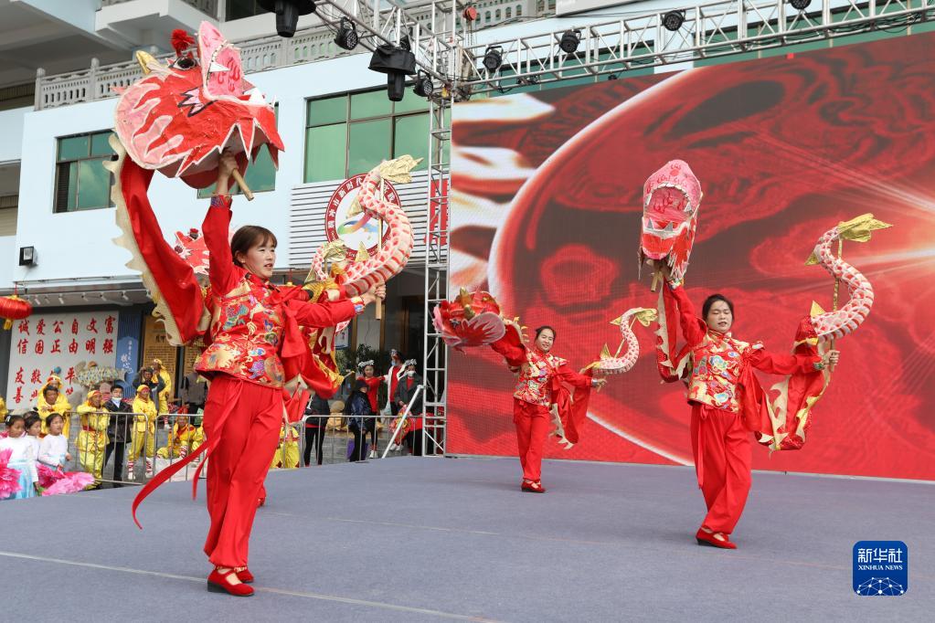 2月5日,在云南省騰沖市北海鎮,女子小背龍舞龍隊在元宵節文藝演出中表演。