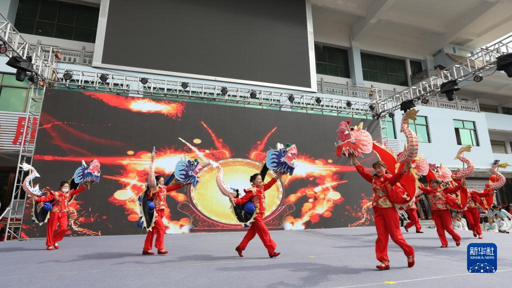 2月5日,在云南省騰沖市北海鎮,女子小背龍舞龍隊在元宵節文藝演出中表演。