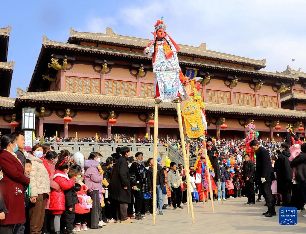 2月5日,在甘肅省平?jīng)鍪徐o寧縣成紀文化城廣場(chǎng),人們在觀(guān)看踩高蹺表演。