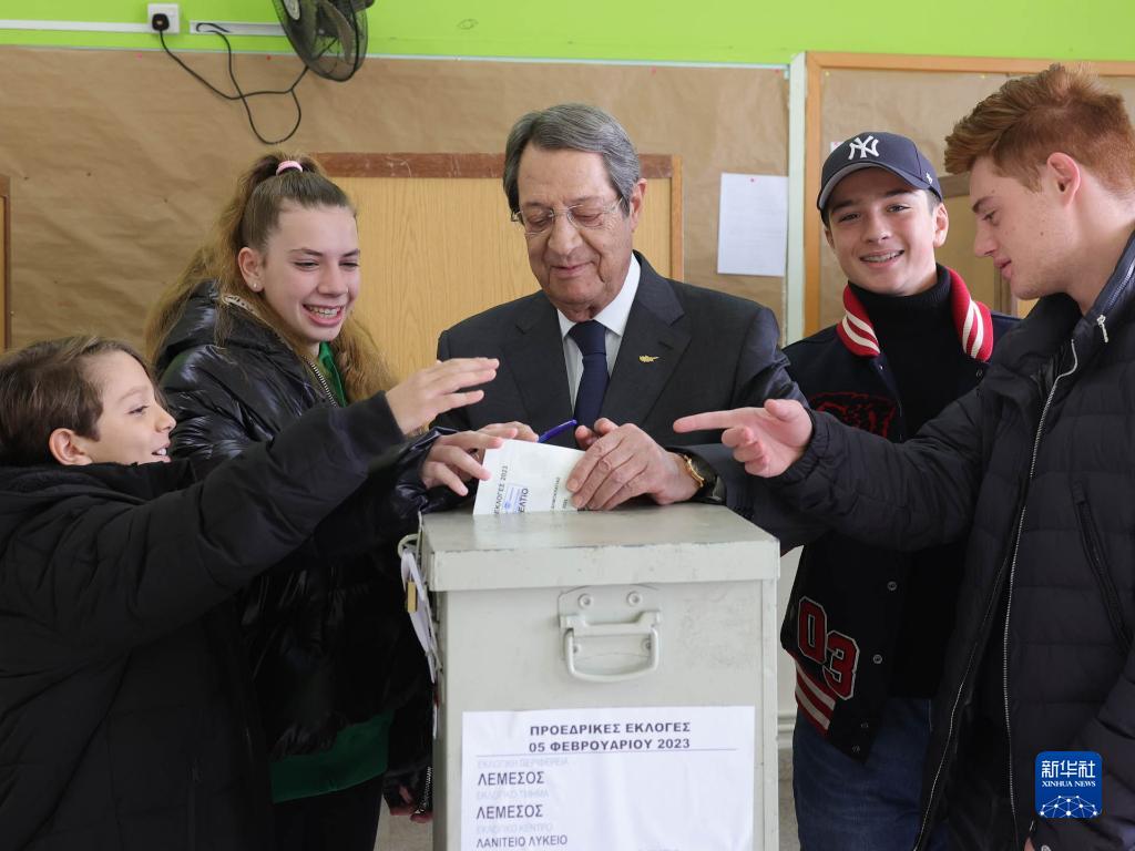 2月5日,現任總統阿納斯塔夏季斯(中)在塞浦路斯利馬索爾的一個(gè)投票站投票。