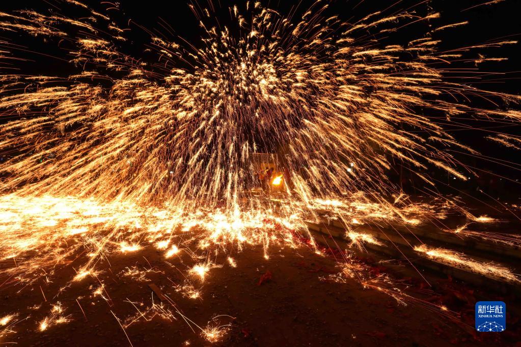 2月5日,民間藝人在貴州省赤水市官渡鎮小廣場(chǎng)表演“打鐵花”。