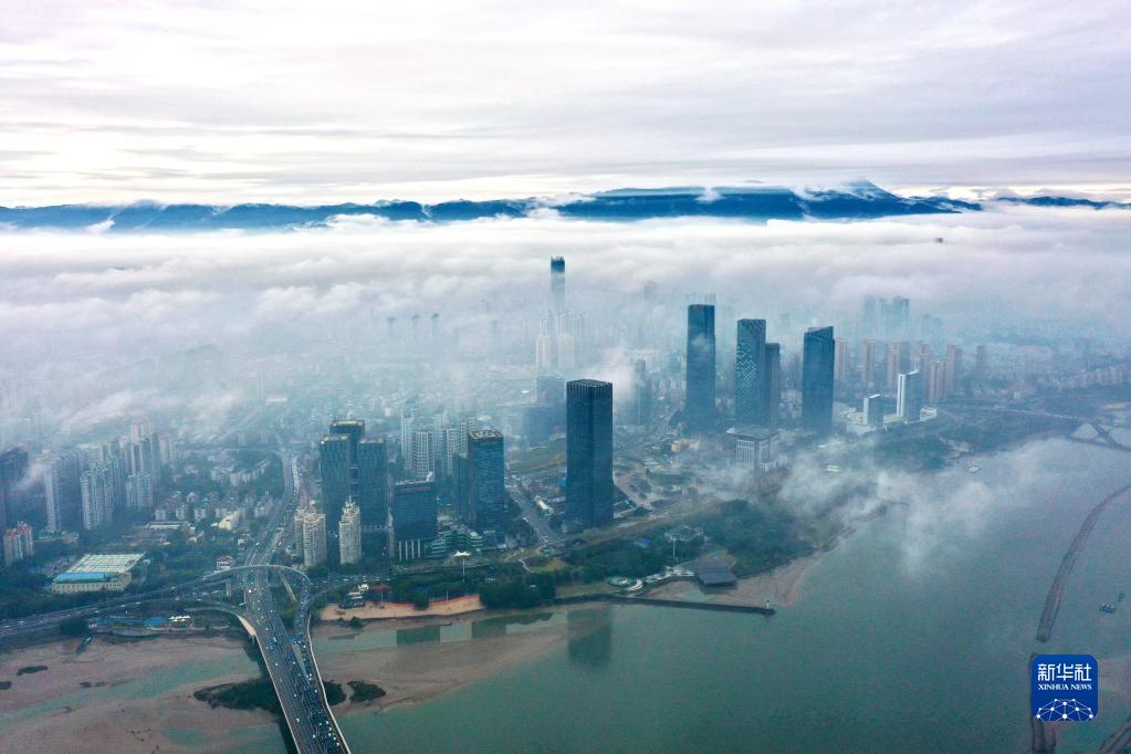 這是平流霧中的福州城市建筑群(2月6日攝,無(wú)人機照片)。