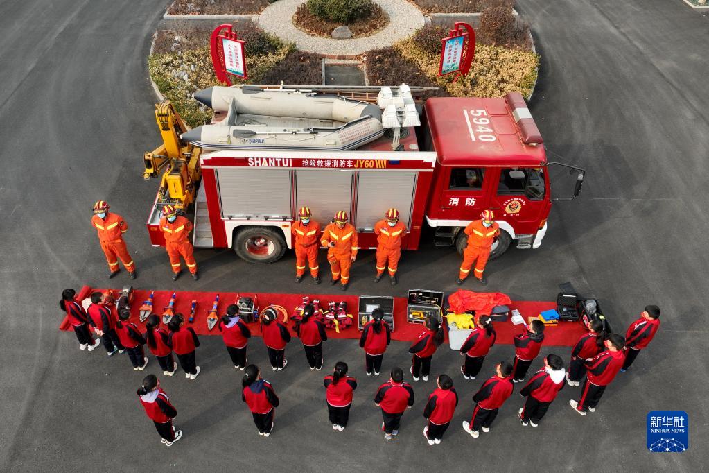 2月6日,在隆堯縣第二實(shí)驗小學(xué),消防員向學(xué)生介紹消防救援設備(無(wú)人機照片)。