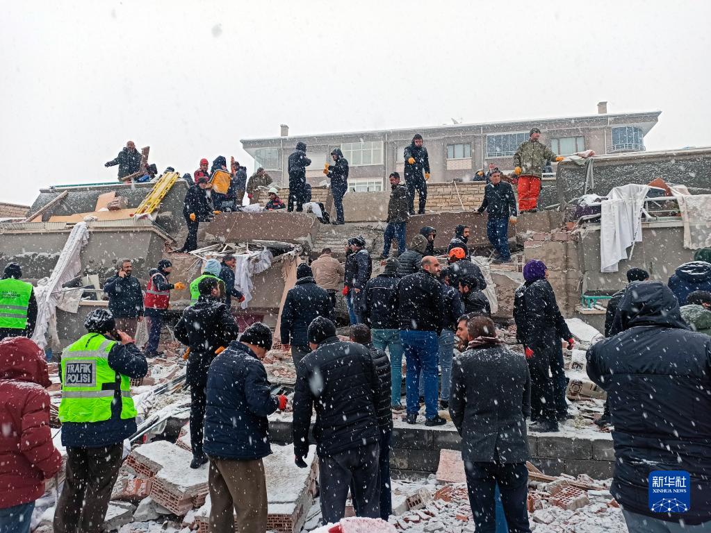 2月6日,人們在土耳其馬拉蒂亞一處倒塌的建筑上搜救。