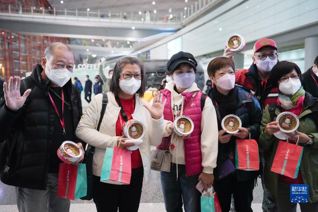 2月6日,內地與港澳人員往來(lái)全面恢復后,香港赴北京首個(gè)旅游團的游客在首都國際機場(chǎng)手拿兔爺紀念品合影。