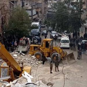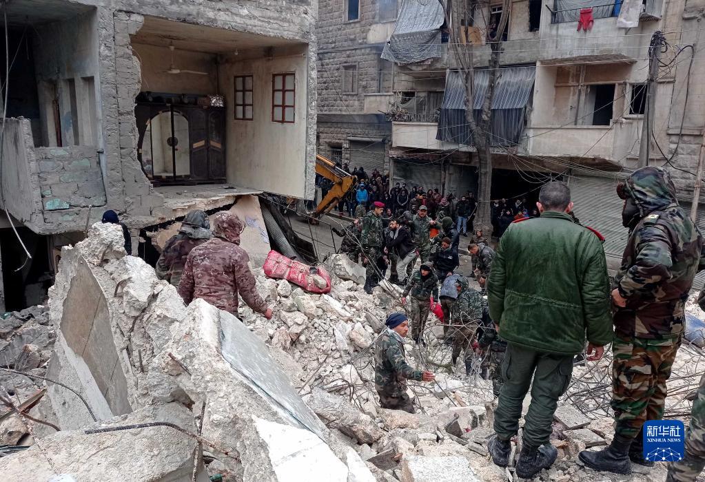 2月6日,人們在敘利亞阿勒頗省一處倒塌的建筑現場(chǎng)進(jìn)行救援。