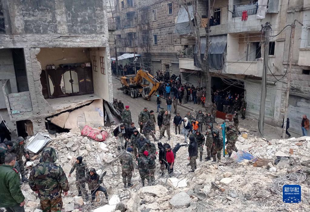 2月6日,人們在敘利亞阿勒頗省一處倒塌的建筑現場(chǎng)進(jìn)行救援。