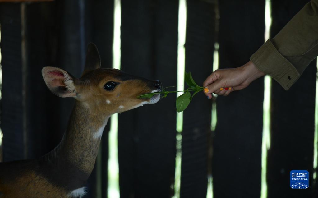 2月4日,游客在肯尼亞納紐基肯尼亞山野生動(dòng)物保護區的動(dòng)物孤兒院內給羚羊喂食。