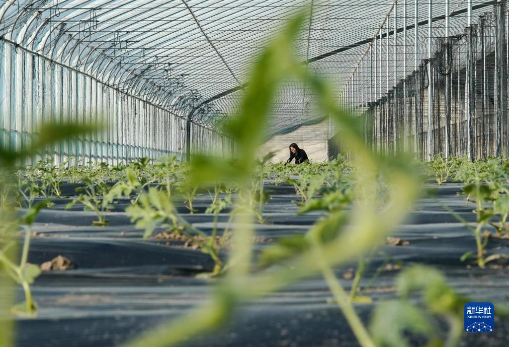 2月7日,河北省灤州市灤城街道楊家院村的農民在大棚內管護西瓜秧苗。