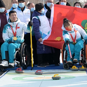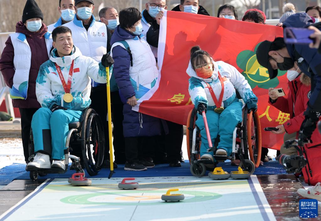 2月7日,北京冬殘奧會(huì )冠軍、中國輪椅冰壺隊隊員陳建新(前左)和隊友閆卓在活動(dòng)上與殘疾人朋友一同體驗旱地冰壺項目。