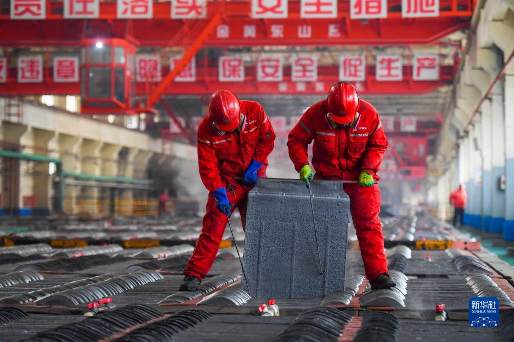 2月7日,工人在內蒙古赤峰市巴林左旗的赤峰山金銀鉛有限公司生產(chǎn)車(chē)間檢查鉛板電解情況。